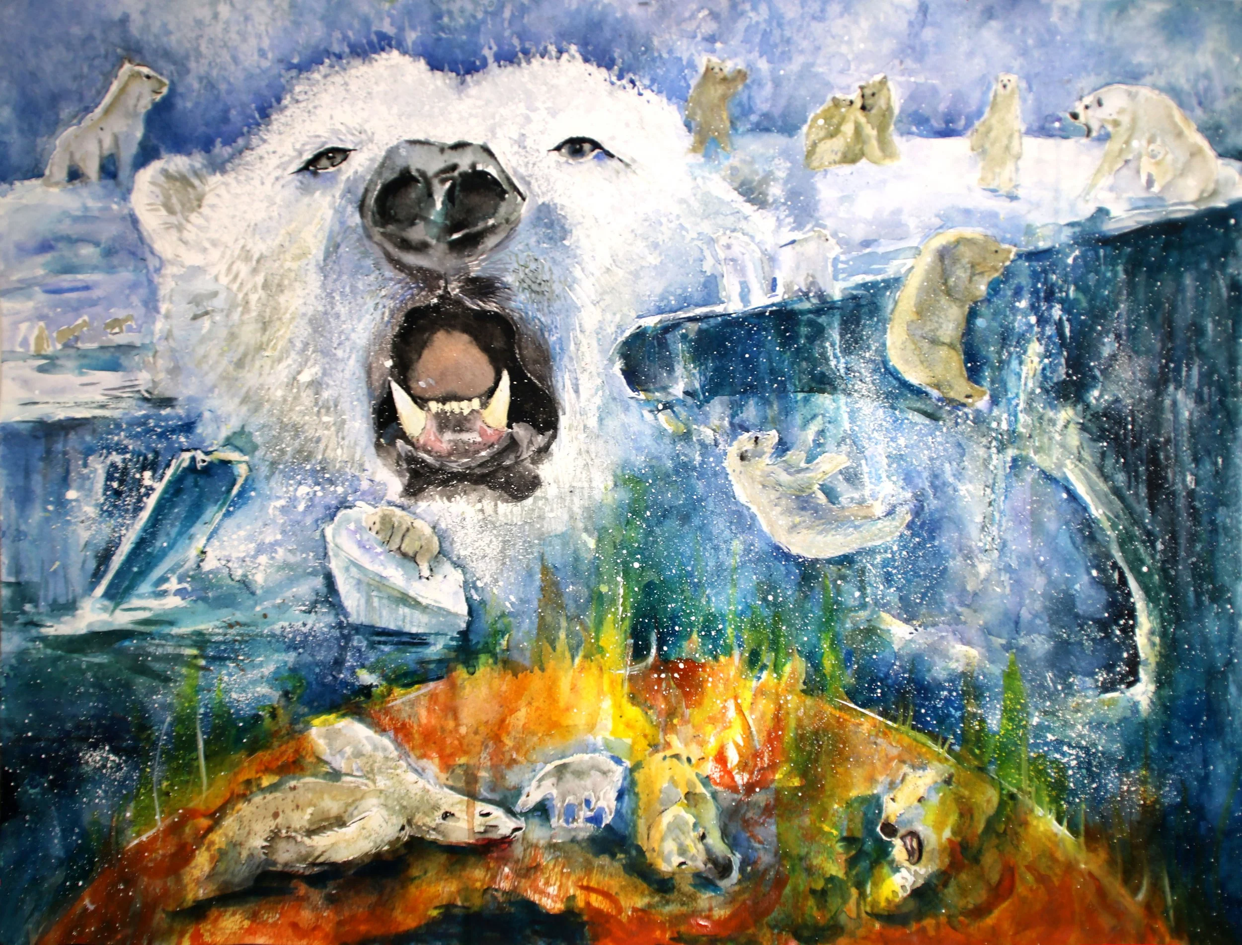 A fearful polar bear roars against a melting Arctic landscape. The breaking ice and falling cubs represent the accelerating collapse of ecosystems as global temperatures rise. Through the medium of paint and canvas, I envision awareness, empathy, and a call to action.